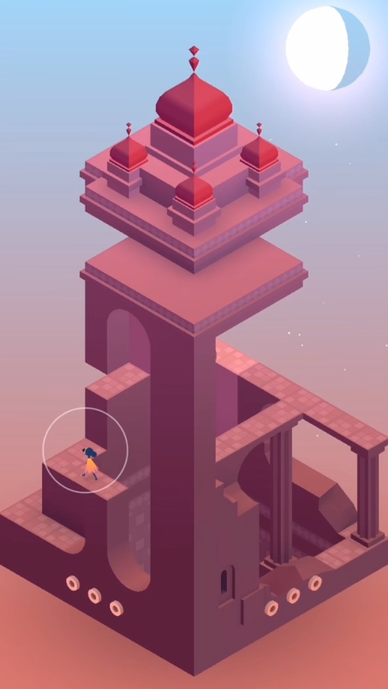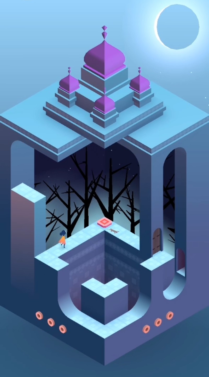 昼夜交替的第三个场景充满诗意,需要通过建筑的整体旋转来调整位置。当萝尔到达特定位置后,再次转动建筑使其能够触碰粉色按钮。第四个场景则要利用两孔移动墙,通过上下移动帮助萝尔进入门内。