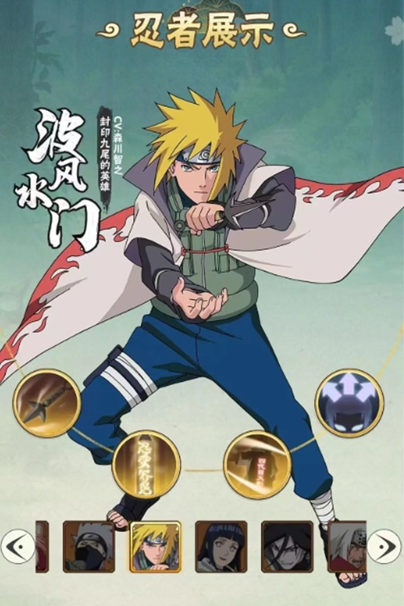 波风水门作为四代目火影,在游戏中同样表现出色。他的主动技能可以对随机3个目标造成170%攻击伤害并附加易伤状态。如果目标带有飞雷神术式印记,暴击率还能提升20%。飞雷神之术不仅能造成两段伤害,还能为队友提供速度加成和效果命中提升。被动技能致命节奏让他在战斗开始时就能获得20%的攻击、速度和暴击率加成。