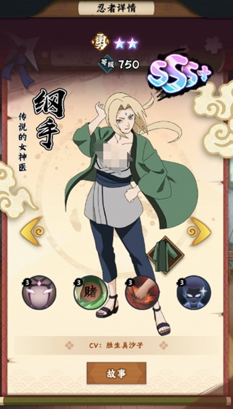 纲手在游戏中展现了强大的生存能力。她的主动技能可以恢复340%攻击力的生命值,百豪状态下攻击力提升40%且每次受到攻击都能回血。被动技能让她有概率造成90%-170%的伤害波动,第三次攻击必定造成250%伤害。普通攻击还有概率触发暴击和眩晕效果,整体属性加成也十分全面。