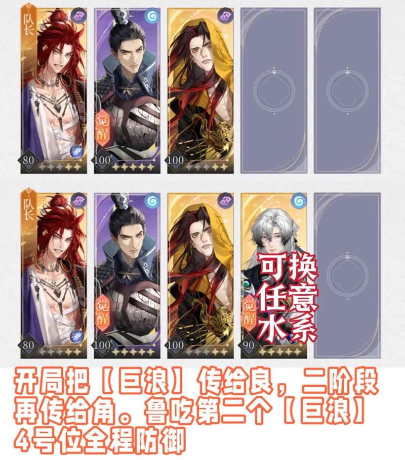 给1号位附加【巨浪】:叠满2层劝退我方全体,下拉防御向右传递
