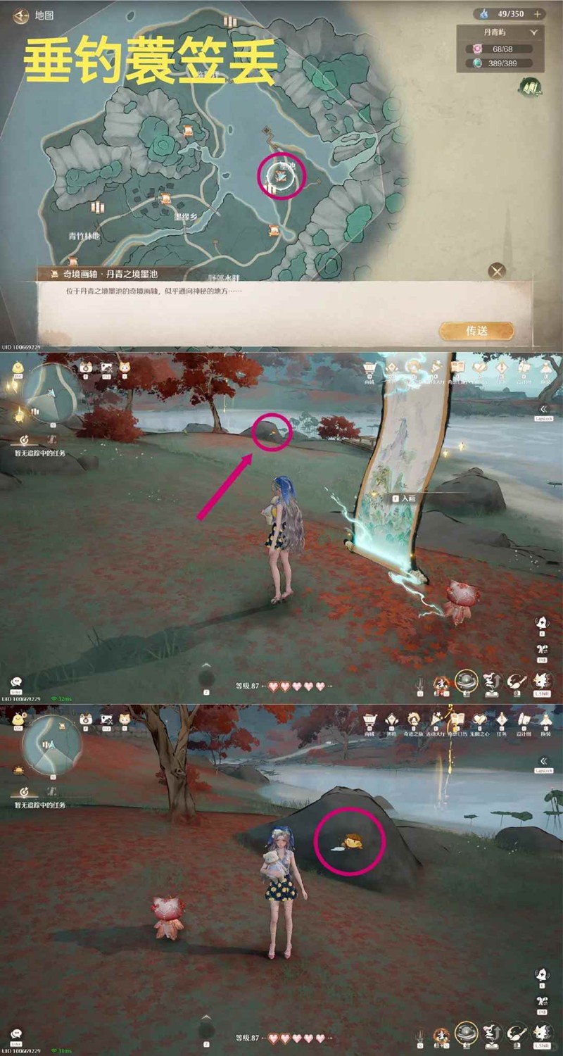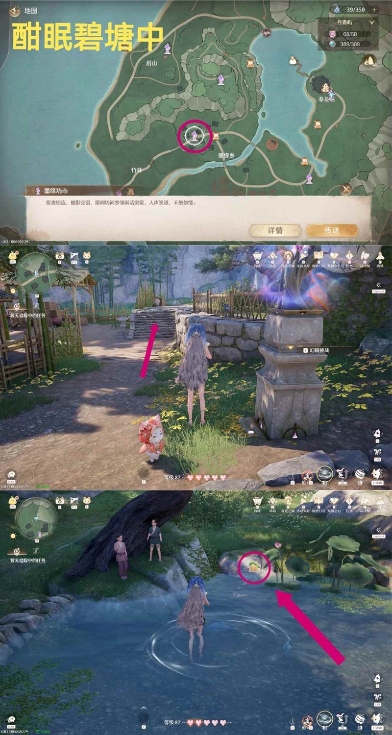 丹青屿「墨缘坊市」锚点,传送过来上楼梯,有一个小池塘,史丢丢就在池塘边的石头上