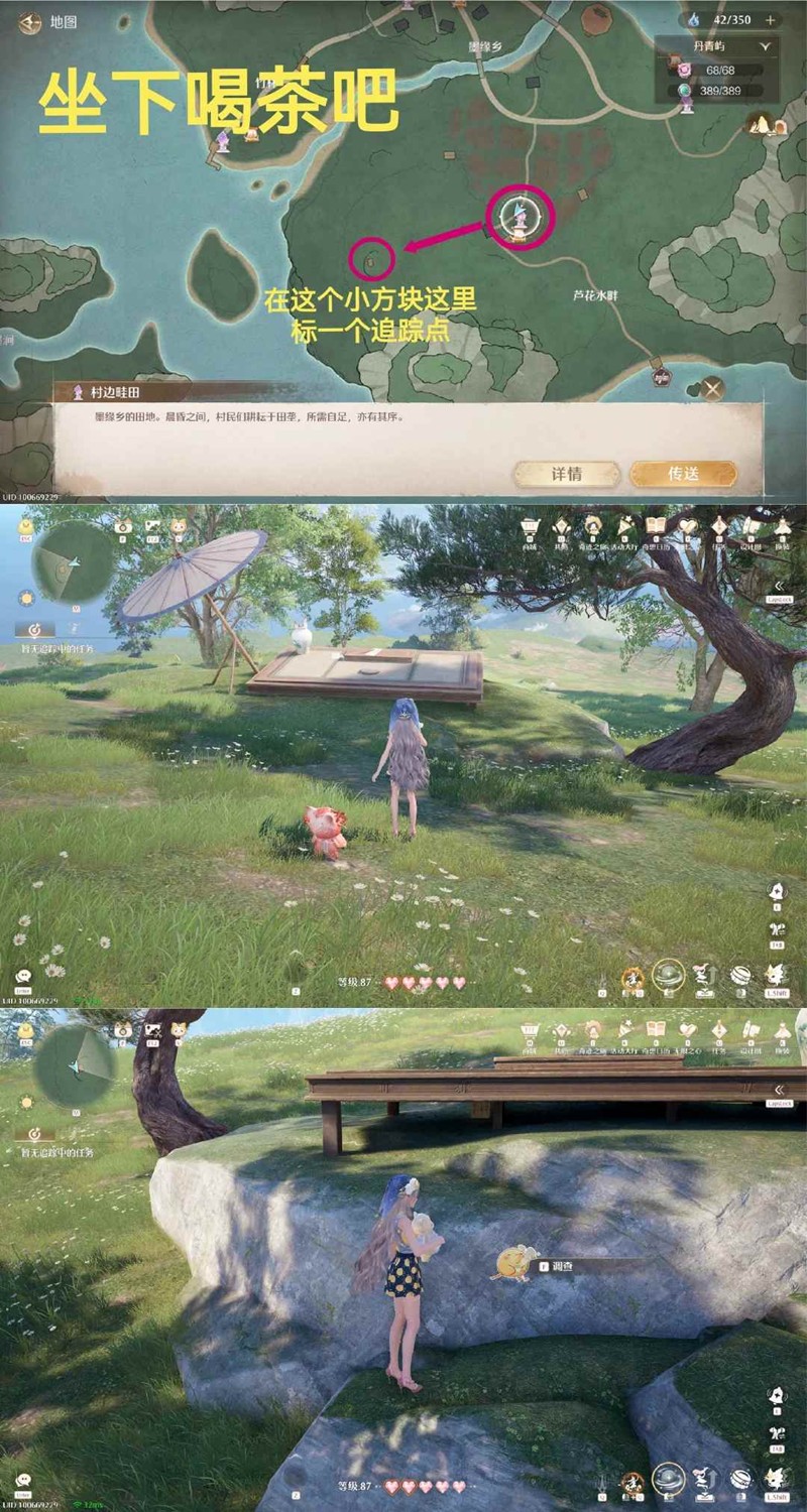 丹青屿「村边畦田」锚点,按图示标一个追踪点,点击追踪,来到追踪点看到一个小桌子,史丢丢就在桌子的下面