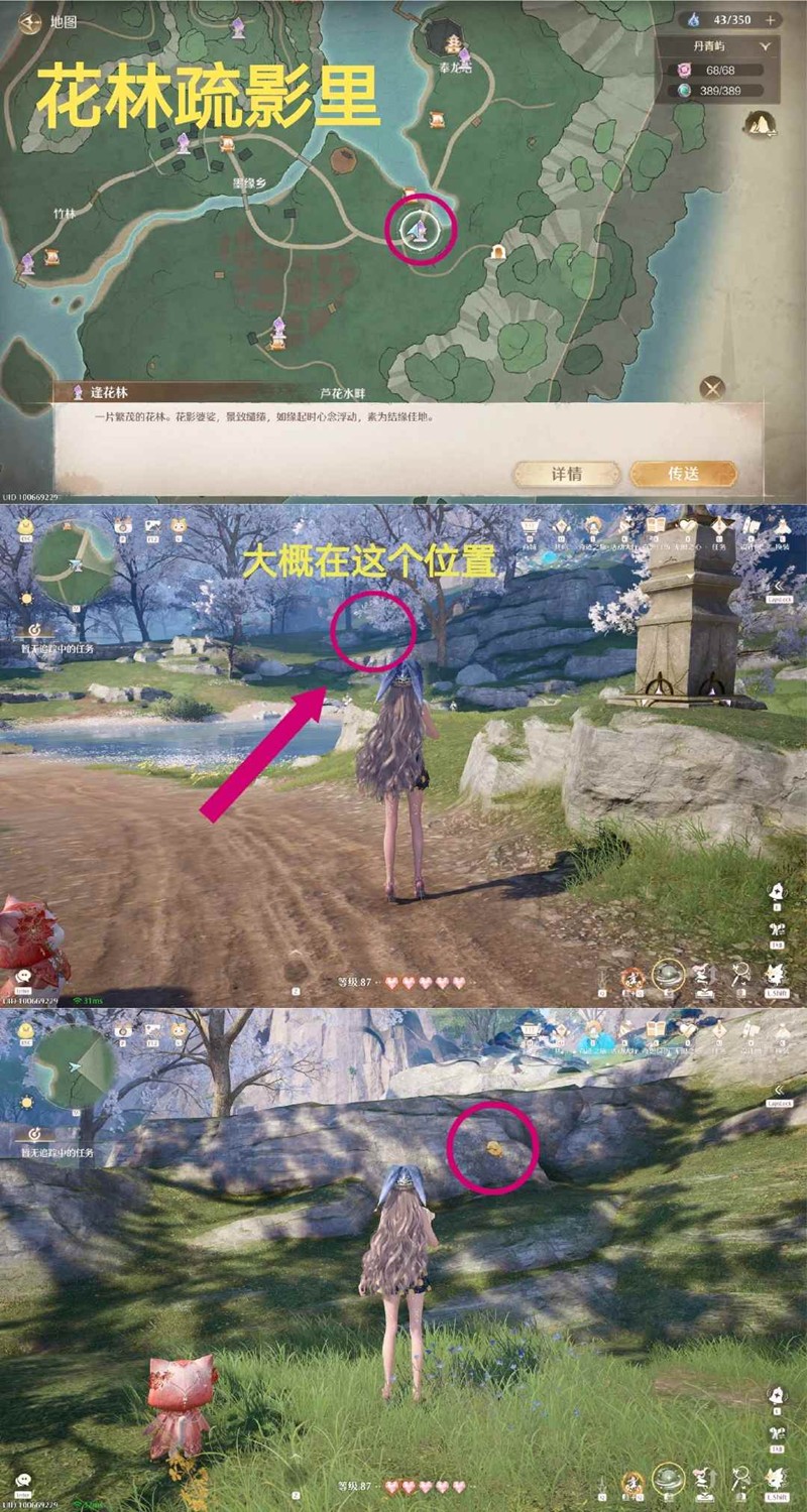 丹青屿「逢花林」锚点,传送过来往河对面的山坡上走,就能看见史丢丢啦
