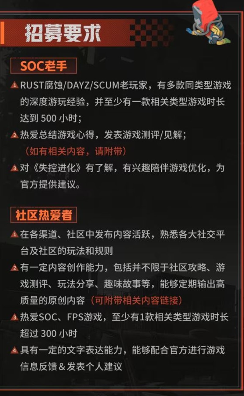 热爱SOC、FPS游戏,至少有1款相关类型游戏时长超过300小时。具有一定的文字表达能力,能够配合官方进行游戏信息反馈和发表个人建议。