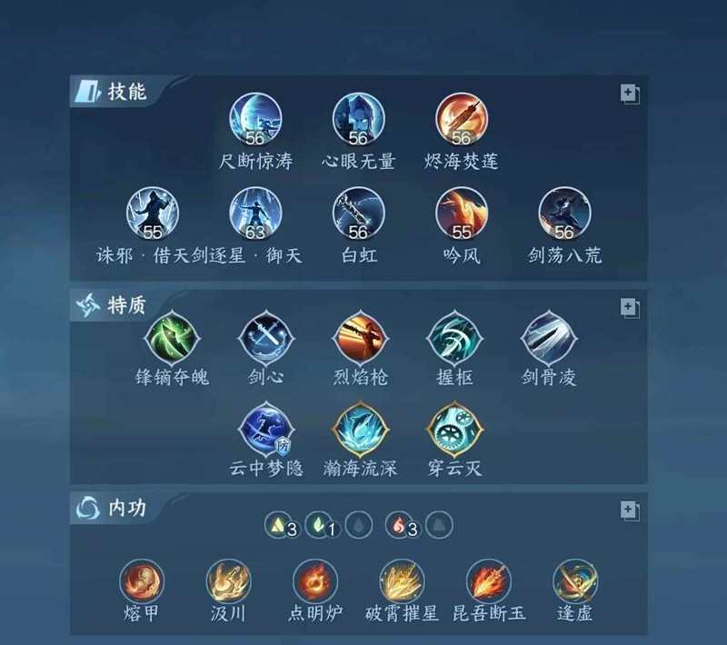 内功方面点明炉,融甲,汲川,昆吾,破霄,逢虚,如果元素允许的情况下可以下掉逢虚