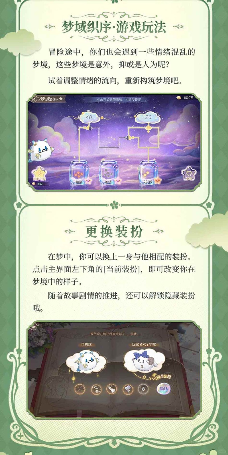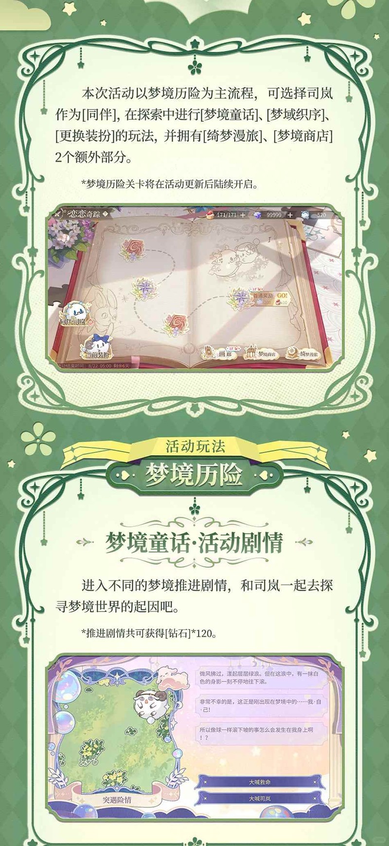 本次活动以梦境历险为主流程,可选择司岚作为[同伴],在历险中进行[梦境童话]、[梦域织序]、[当前装扮]的玩法,并拥有[绮梦漫旅]、[梦境商店]2个额外部分。