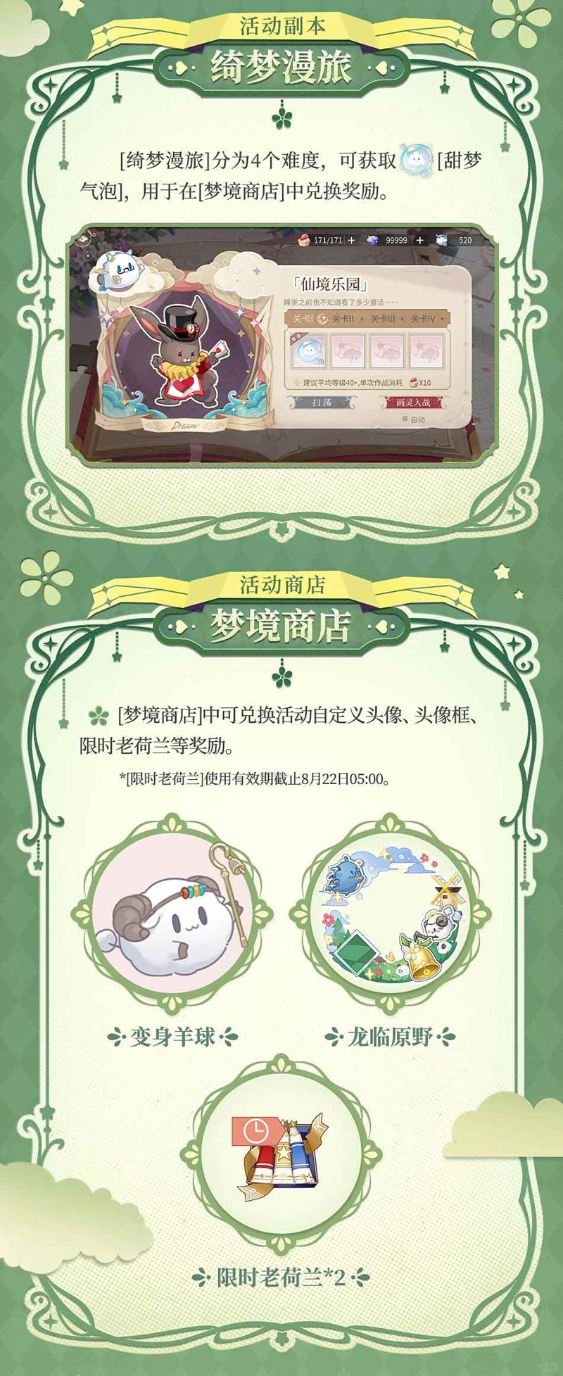 ► [绮梦漫旅]&[梦境商店]:通过[绮梦漫旅]获得道具[甜梦气泡],可在[梦境商店]中消耗获取奖励。