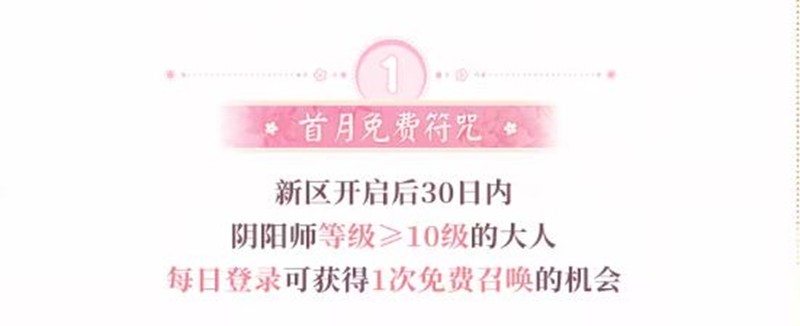 新区开启后30日内,阴阳师等级≥10级的玩家每日登录可获得1次免费召唤的机会。