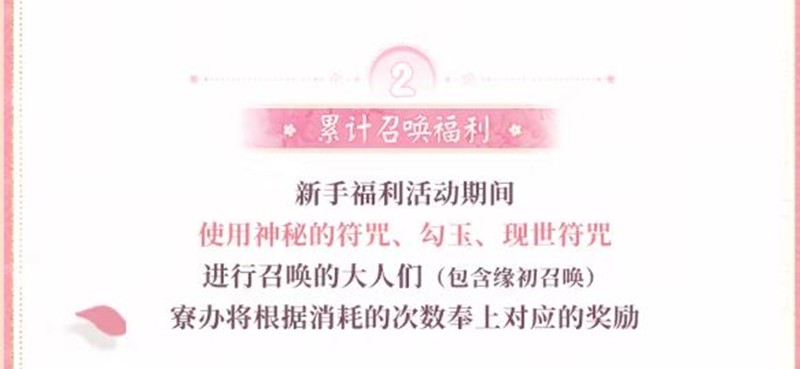 新手福利活动期间,使用神秘的符咒、勾玉、现世符咒进行召唤的大人们(包含缘初召唤)累计消耗对应次数将会分别获得不同奖励。奖励包含指定范围内自选SSR阶式神、随机SSR阶式神、御行达摩、神秘的符咒及奉为达摩等。