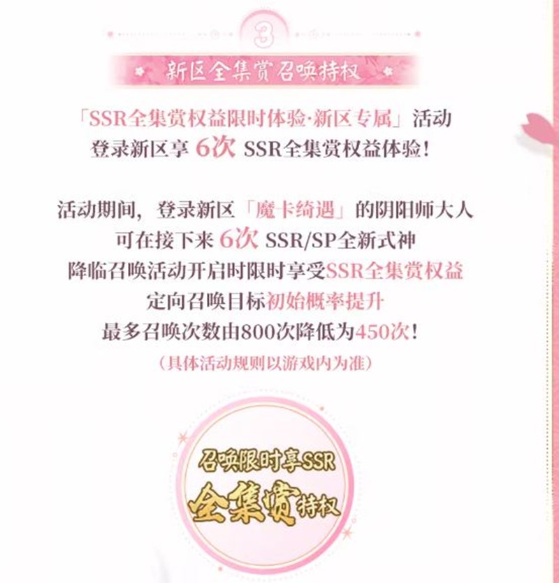 「SSR全集结权益限时体验-新区专属」活动,登录新区享6次SSR全集结权益体验!活动期间,登录新区「魔卡绮遇」的阴阳师大人可在接下来6次SSR/SP全新式神降临召唤活动开启时享受SSR全集结权益,定向召唤目标初始概率提升,最多召唤次数由800次降低为450次!