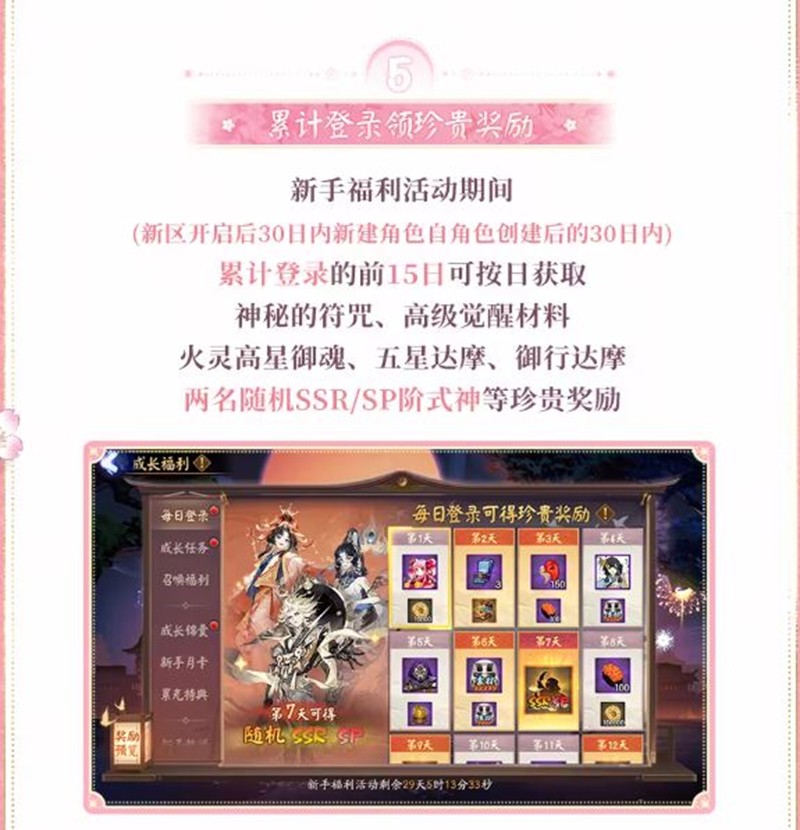 新区福利活动期间(新区开启后30日内新建角色自角色创建后的30日内),累计登录的前15日可按日获取神秘的符咒、高级觉醒材料、火灵高星御魂、五星达摩、御行达摩两名随机SSR/SP阶式神等珍贵奖励。