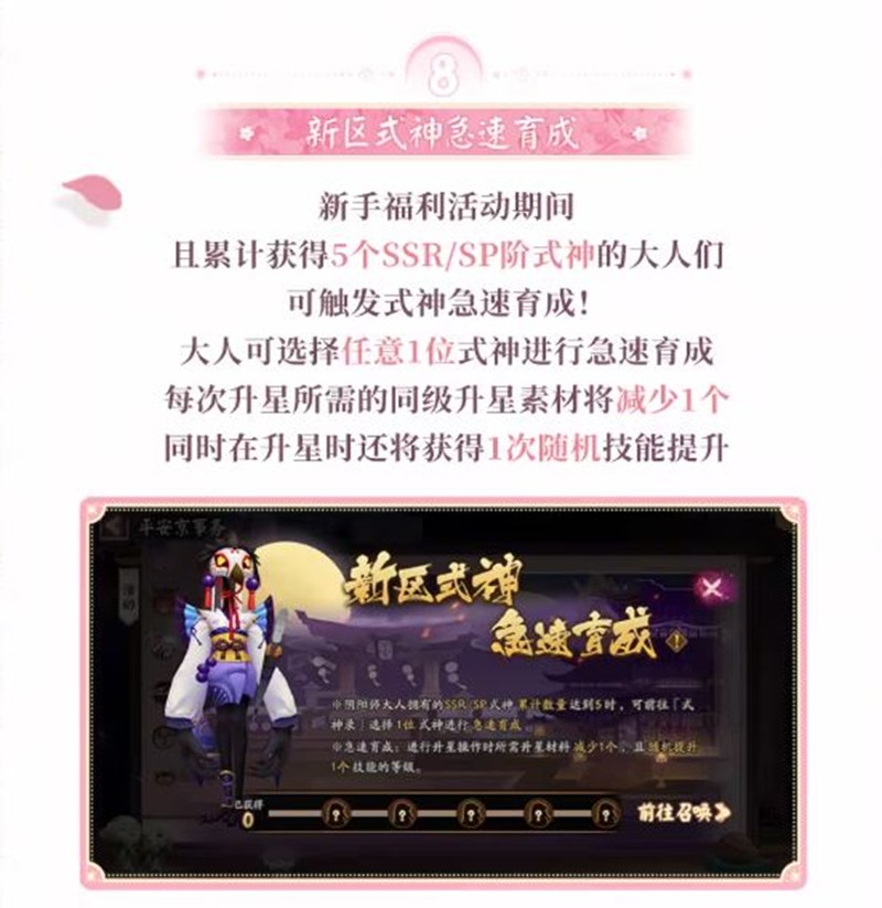 新手福利活动期间且累计获得5个SSR/SP阶式神的大人们可触发式神急速育成!大人可选择任意1位式神进行急速育成,每次升星所需的同级升星素材将减少1个,同时在升星时还将获得1次随机技能提升。