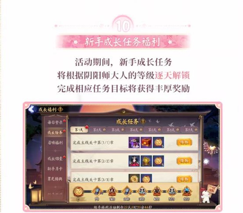 活动期间,新手成长任务将根据阴阳师大人的等级逐天解锁,完成相应任务目标将获得丰厚奖励。
