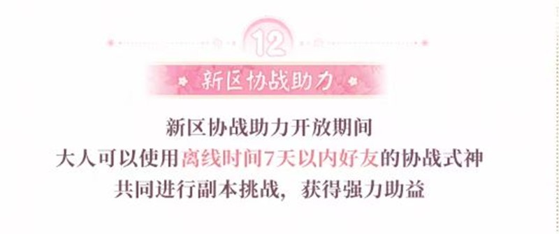 新区协战助力开放期间,大人可以使用离线时间7天以内好友的协战式神共同进行副本挑战,获得强力助益。