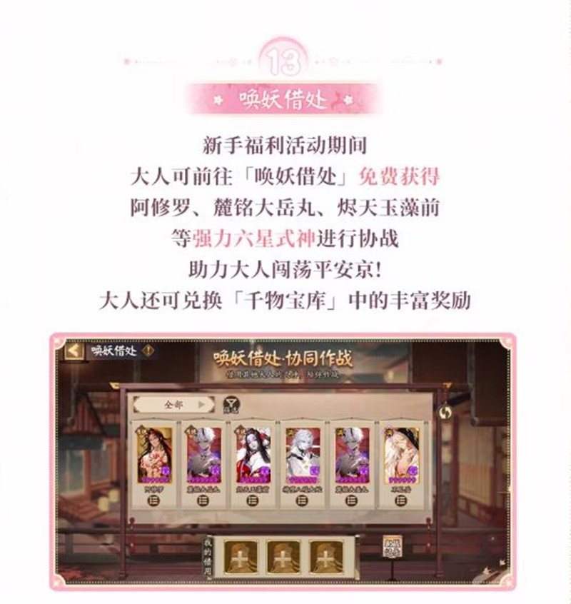 新手福利活动期间,大人可前往「唤妖借处」免费获得阿修罗、麓铭大岳丸、烬天玉藻前等强力六星式神进行协战,助力大人闯荡平安京!大人还可兑换「千物宝库」中的丰富奖励。