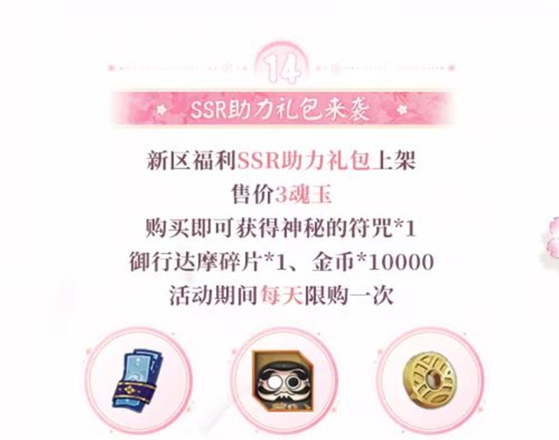 新区福利SSR助力礼包上架,售价3魂玉,购买即可获得神秘的符咒1、御行达摩碎片1、金币*10000,活动期间每天限购一次。