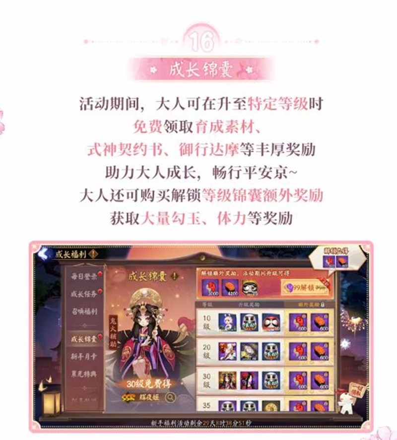 活动期间,大人可在升至特定等级时免费领取育成素材、式神契约书、御行达摩等丰厚奖励,助力大人成长,畅行平安京~大人还可购买解锁等级锦囊额外奖励,获取大量勾玉、体力等奖励。