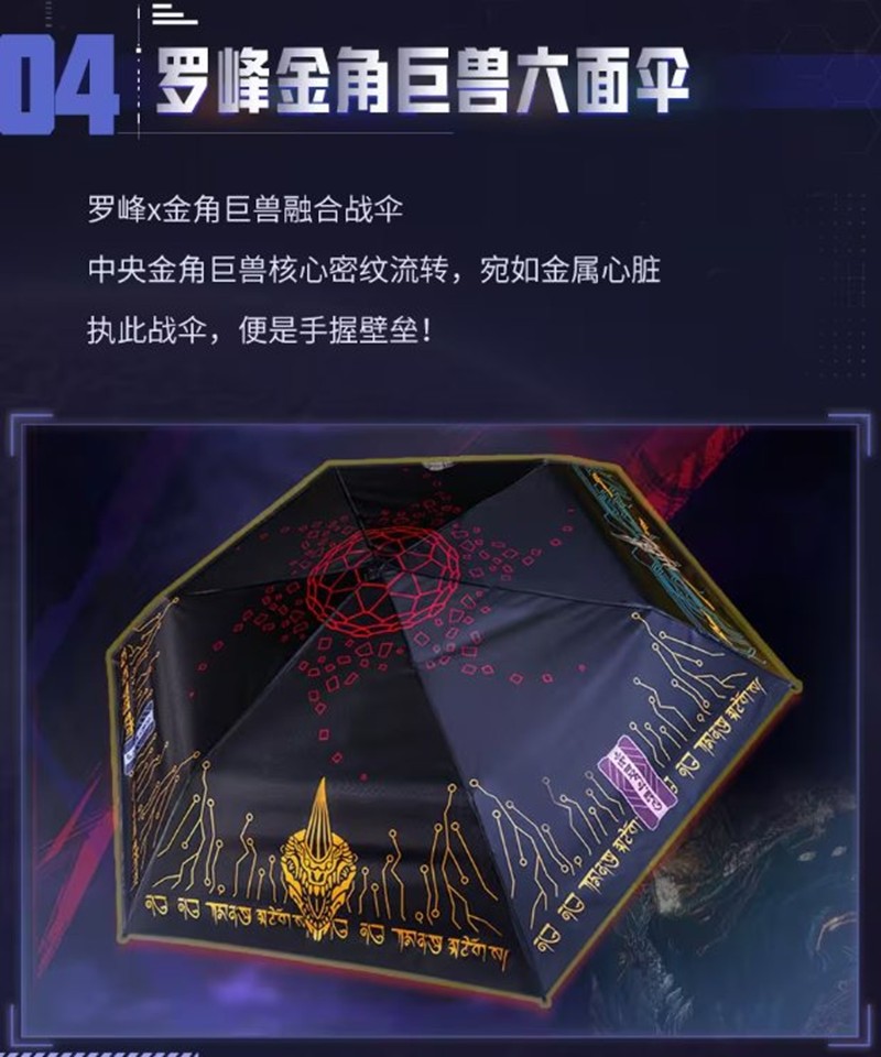 这款六面伞以罗峰和金角巨兽为主题,设计独特,功能实用。伞面采用高密度布料,能够有效阻挡雨水和阳光。伞柄和伞骨采用坚固的材料制作,耐用性强。伞面上印有罗峰和金角巨兽的图案,极具收藏价值。