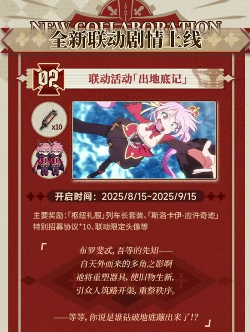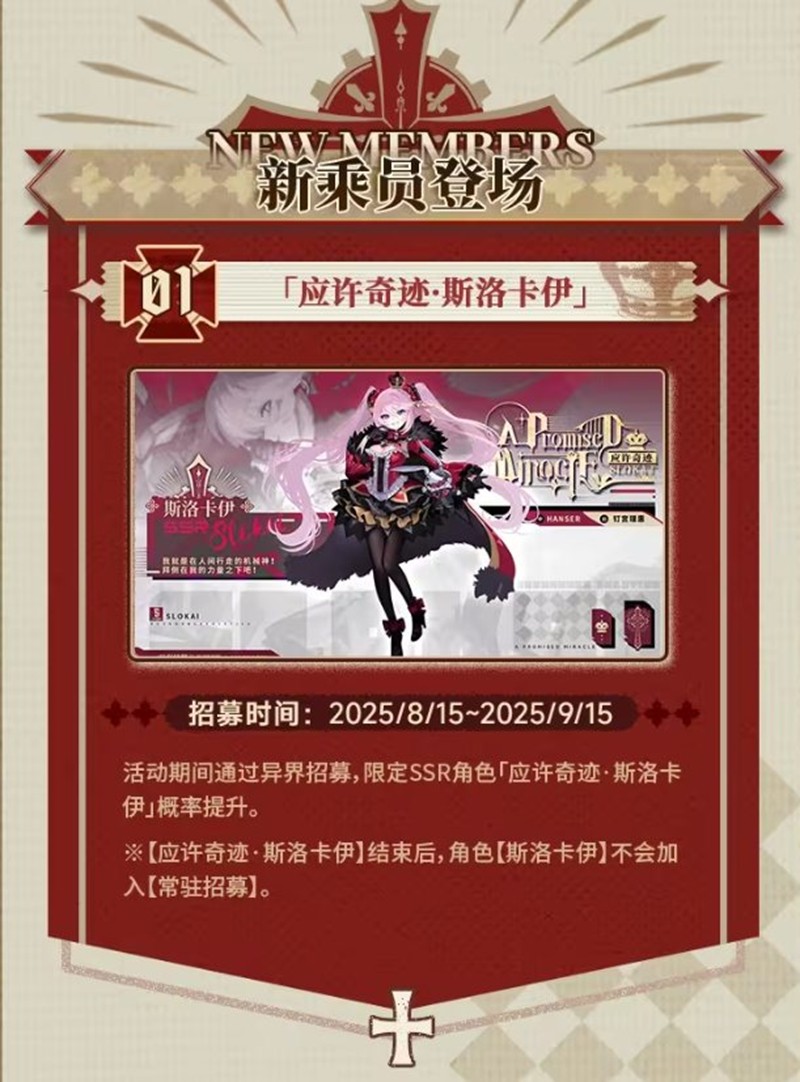 在本次联动活动中,限定SSR角色「应许奇迹·斯洛卡伊」概率提升,玩家可以通过异界招募获得这位新乘员。活动时间为2025年8月15日至2025年9月15日。值得注意的是,「应许奇迹·斯洛卡伊」在活动结束后不会加入常驻招募,想要获得这位角色的玩家千万不要错过!