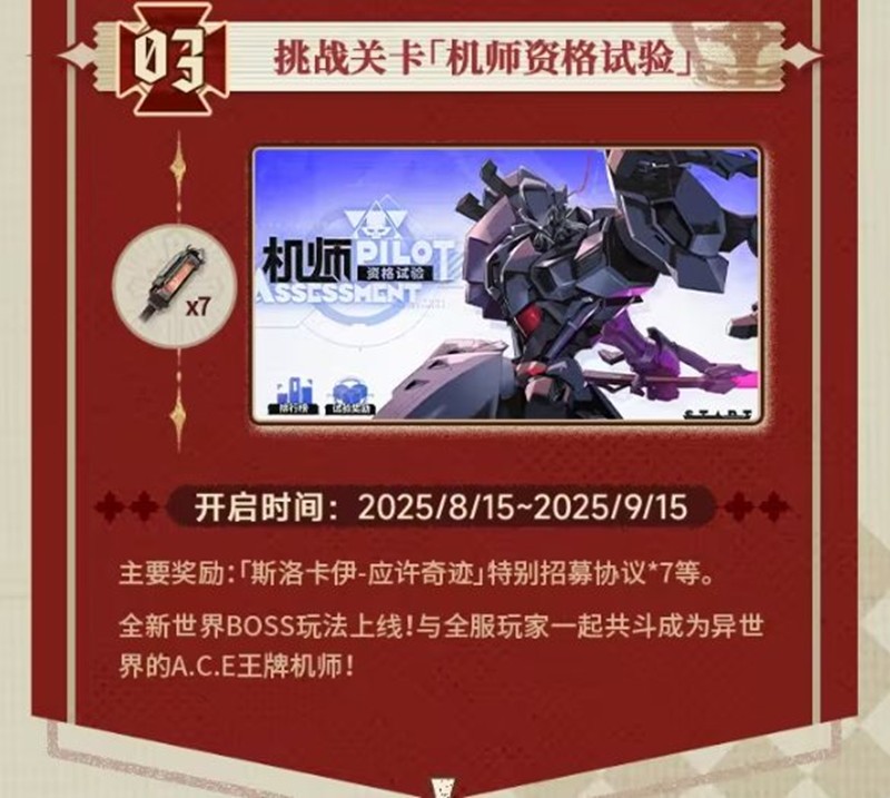 主要奖励:「斯洛卡伊·应许奇迹」特别招募协议*7等。全新世界BOSS玩法上线!与全服玩家一起共斗成为异世界的A.C.E王牌机师!