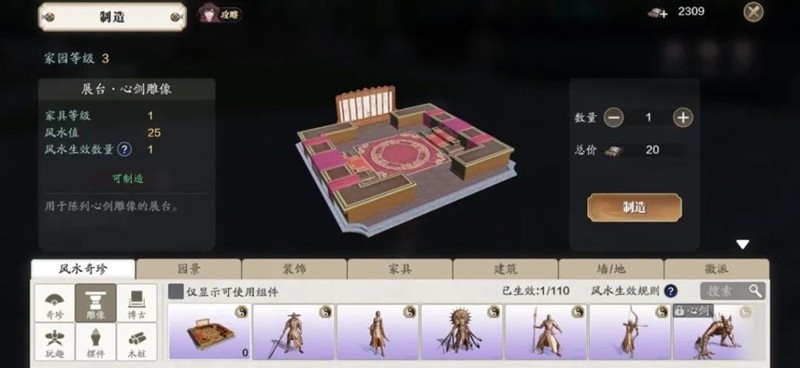 家园系统开放后,建造风水奇珍里的展台-心剑雕像非常重要。
