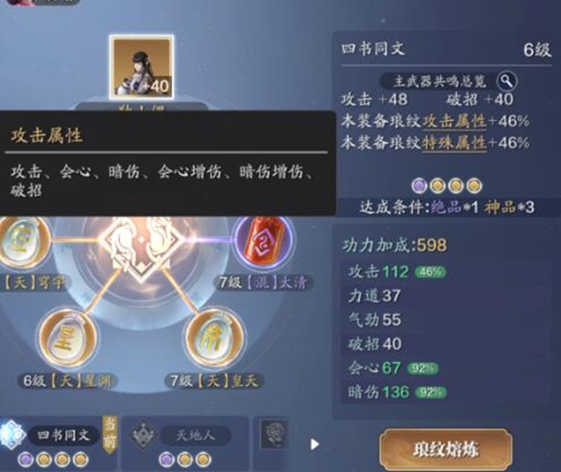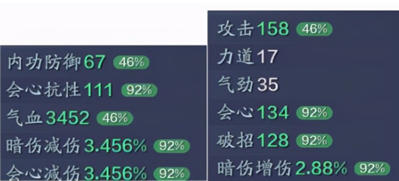 3多紫将力道气劲加成转为特殊属性加成;4金1紫方案使基础攻击翻倍,并额外获得60%破招加成。