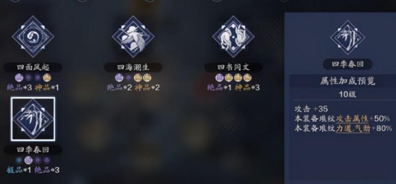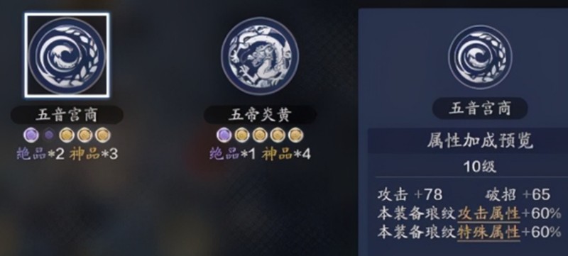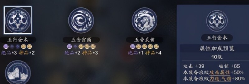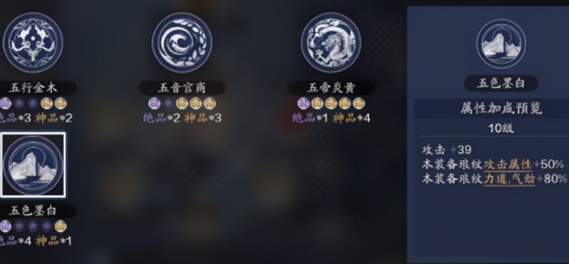 不同数量的金色琅纹会带来不同的加成效果,从全紫到4金1紫共有五种搭配方案。