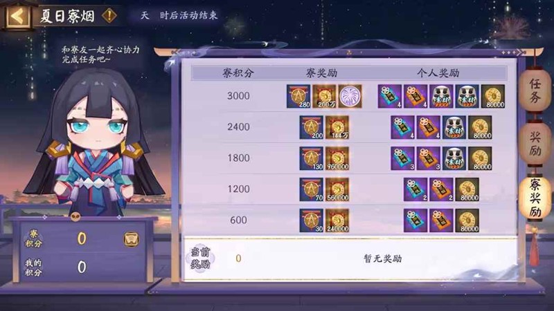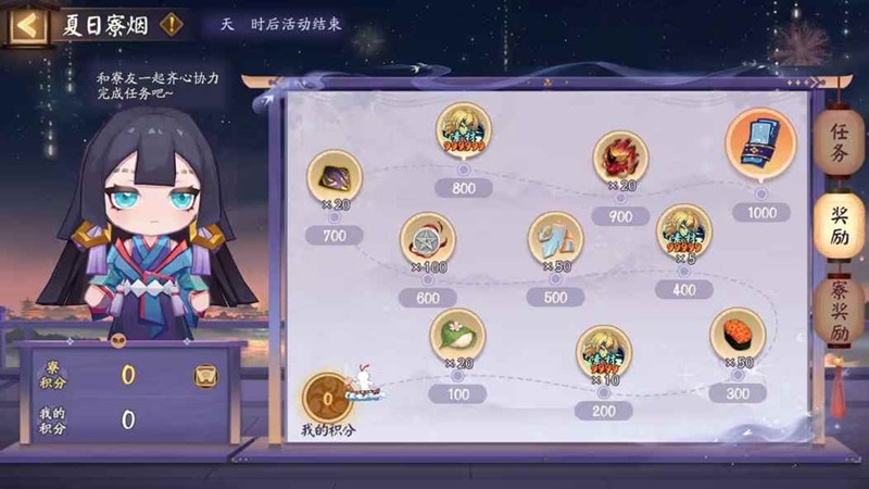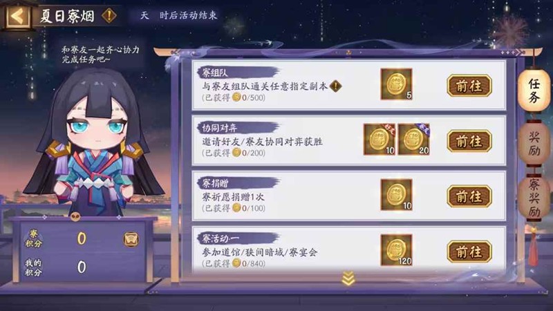 活动期间,阴阳师大人和寮友/好友齐心协力完成各类任务,可以获取相应的积分。部分组队任务可享受燃烧的胧车单人特权,单人也可完成。