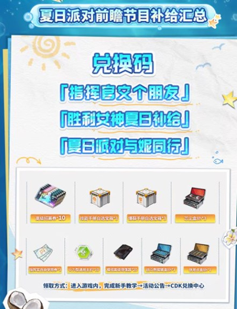 在夏日派对前瞻节目中,官方为玩家们准备了一系列丰富的补给兑换码,包括: