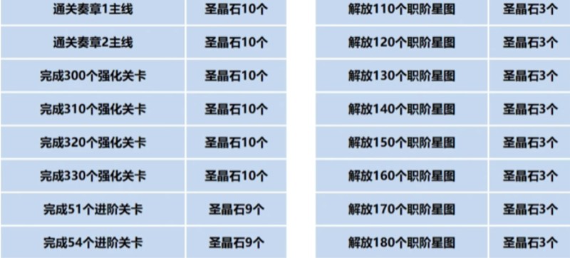 除了限时活动外,17项主线推进任务也是重要的圣晶石来源。每完成一项主线任务可以获得10颗圣晶石,全部完成可获得170颗。这些任务没有时间限制,玩家可以慢慢完成。此外,强化关卡任务全部完成后还能获得40颗圣晶石。