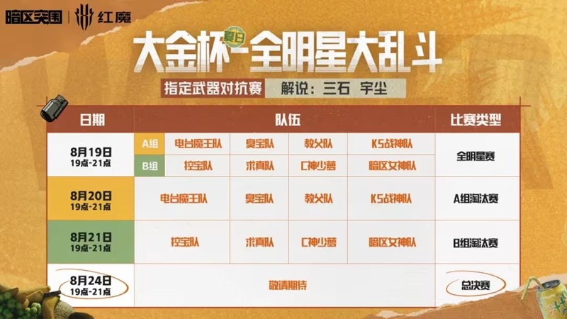 【夏日大金杯&全明星大乱斗】指定武器对抗赛,32+人气主播,4天精彩角逐!观赛还有红魔手机、6格安全箱、大金等好礼等你赢!