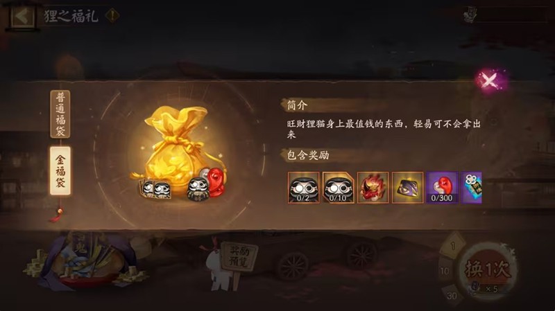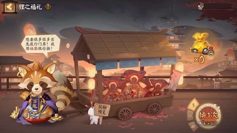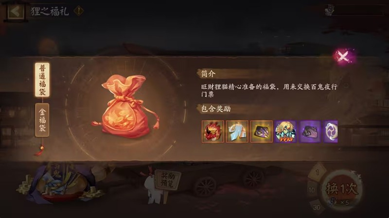 等级≥15级的玩家可以使用百鬼夜行门票与旺财狸猫交换福袋,获得随机道具奖励。