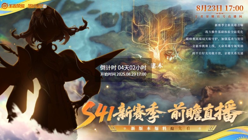 备受玩家期待的《王者荣耀》S41新赛季即将到来,官方已经宣布,新赛季的前瞻直播将于8月23日隆重举行。本次直播将为玩家们揭开新赛季的神秘面纱,带来最新的游戏动态和精彩内容。