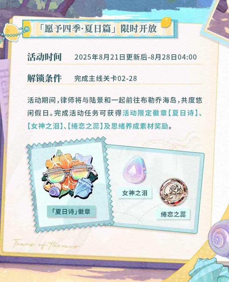 《未定事件簿》「愿予四季·夏日篇」限时活动开放~8月21日更新后-8月28日,活动期间,律师将与陆景和一起前往布勒乔海岛,共度悠闲假日。完成活动任务可获得活动限定徽章【夏日诗】、【女神之泪】、【绻恋之蕊】及思绪养成素材奖励,一起来和小编看看吧~
