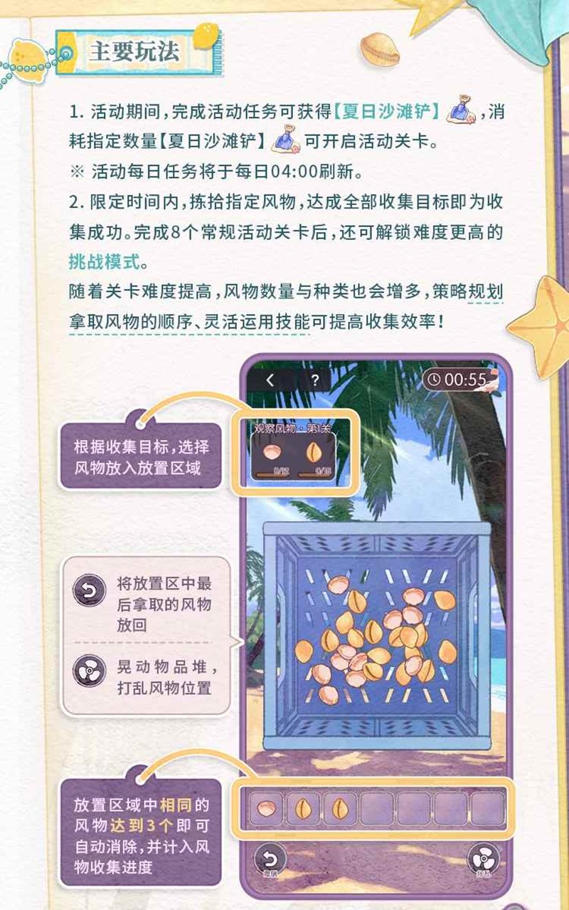 1.活动期间,完成活动任务可获得【夏日沙滩铲】耗指定数量【夏日沙滩铲】 可开启活动关卡。