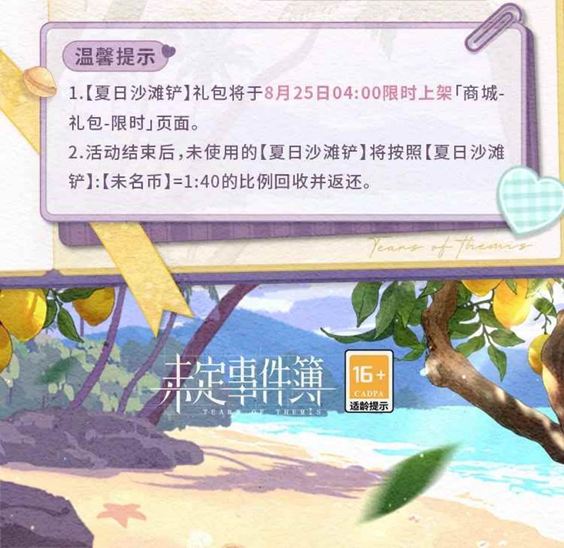 1.【夏日沙滩铲】礼包将于8月25日04:00限时上架「商城-礼包-限时」页面。