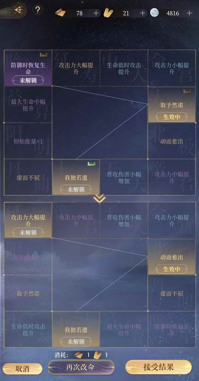 动而愈出:黄金剑不再主动行动后造成伤害,而且我方密探受到攻击后形成触发伤害,这个命盘建议搭配王粲的链子一起用!