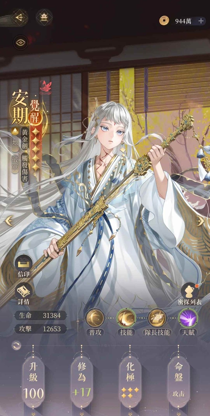 2.【黄金剑】我方拥有黄金剑的单位行动时,额外对敌方全体造成伤害,安期死亡黄金剑消失,普攻技能防御都算行动