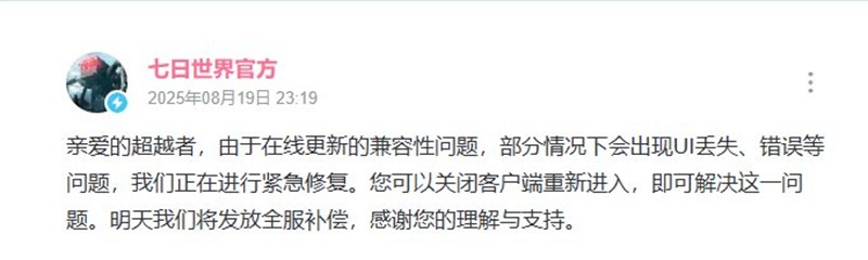 七日世界项目组表示在游戏更时,游戏中出现兼容性问题,目前开发团队已进行紧急修复。问题包括部分情况下会出现UI丢失、错误等问题等,官方发文表示将全服补偿,我们来一起看看。