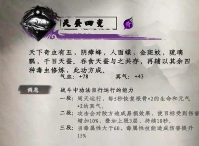 天蚕四变的获取方式相对简单,玩家只需前往坐标990-1239区域,收集一些独宠并交给养蛊之人即可学会。这门功法可以让攻击附加易损效果,并在毒属性超过60时提升15%毒系技能伤害,是毒系流派的优选。周天吐纳功则在完成主线任务后自动获得,属于较为基础的内功心法。