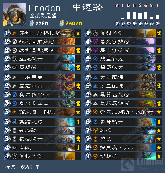 卡组介绍:65%胜率的龙骑+几个小鱼人,和以前的龙骑打法一致,竞技场怎么打就怎么打~