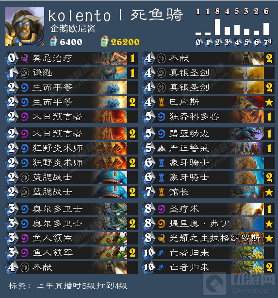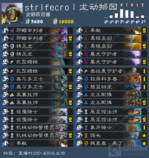 卡组介绍:卡组名是英文直译的,比上面那套中速骑要快一些,前期找低费拍怪,直播时从400打到200,又掉回400左右。