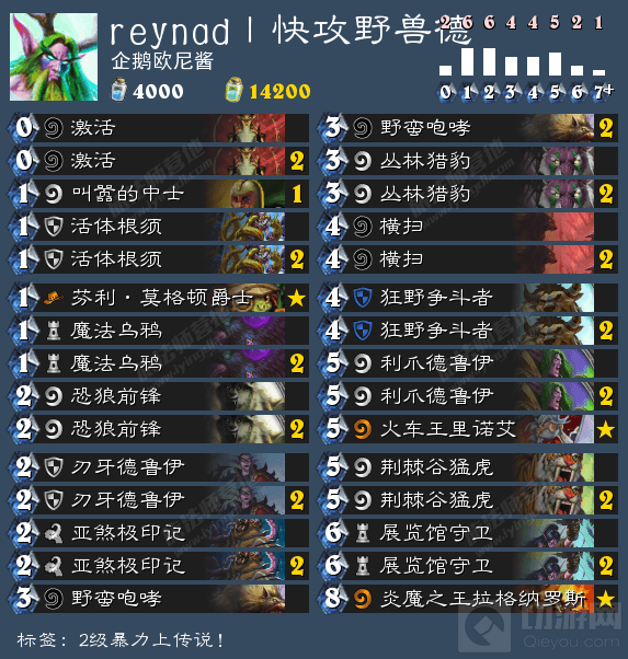 卡组介绍:这里分享三套不同构筑思路的野兽德,reynad这套是我目前加过外服众多野兽德卡组中差不多最凶的野兽德了,毕竟reynad作为动物园创始人,打法异常之凶,上午此卡组还帮他从2级打上了传说。