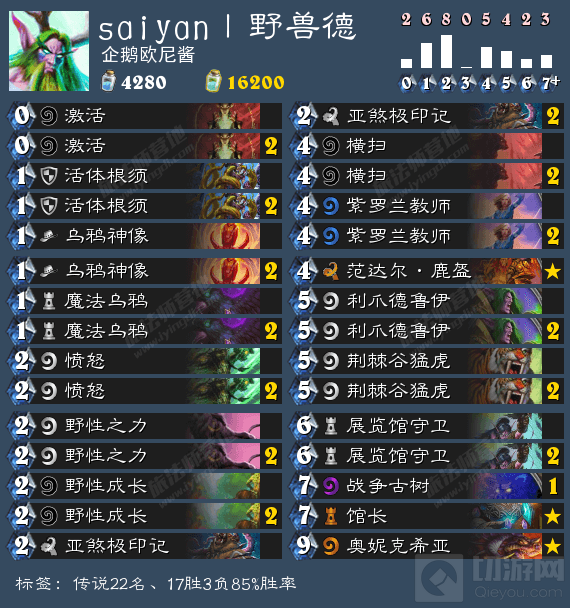 卡组介绍:saiyan开了冒险之后,很快就用这套牌打了一个17胜3负,冲到了传说22名,可见野兽德之强大。这套牌只有黑龙妹妹一张龙,而且没有鱼人。