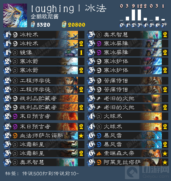 卡组介绍:laughing目前又用冰法打到了传说前10,6费之上只有一张红龙,操作难度要求高,不建议新手使用,同时给3星~