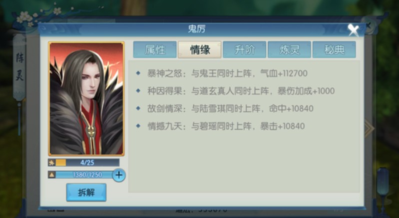 鬼厉的核心技能“狂鬼击”具备极高的爆发伤害,能够在短时间内对敌人造成致命打击。在战斗进入白热化阶段,其专属技能还能触发连击效果,使他在清怪时效率极高。这一特性也让他在团队中担任主力输出位成为可能。除了技能输出外,鬼厉在情缘系统上的搭配也十分丰富,与鬼王、道玄真人、陆雪琪、碧瑶等角色一同上阵时,可获得大量属性加成,包括气血、爆伤、命中和暴击等,进一步提升其战斗表现。