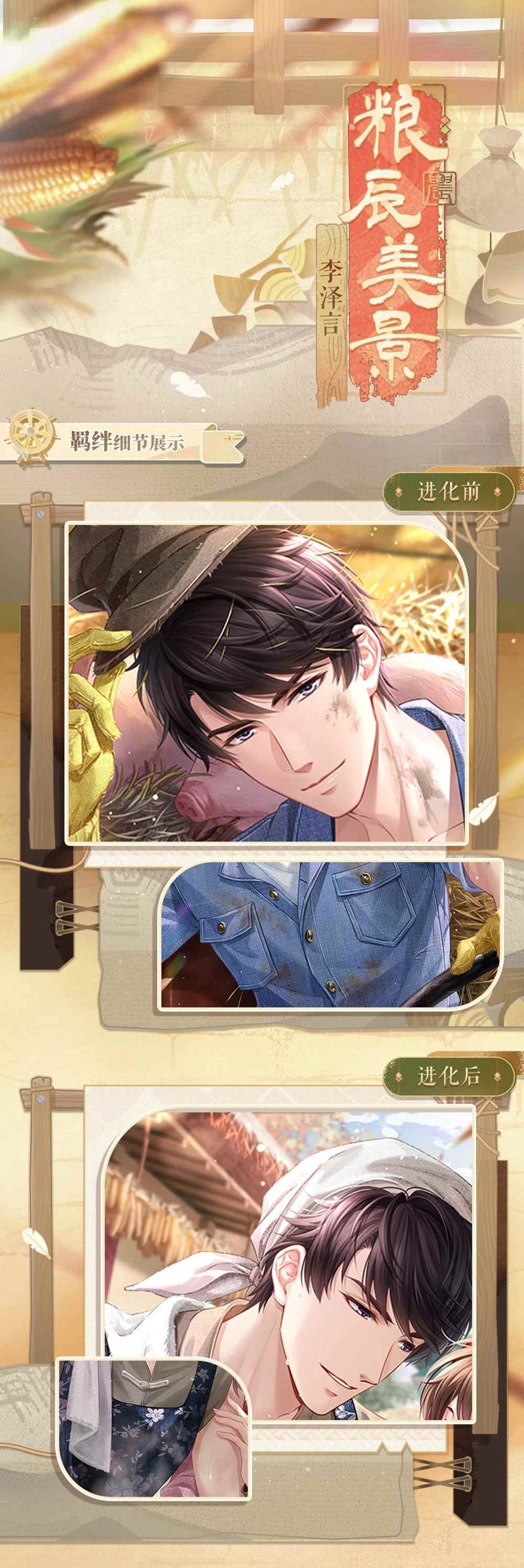 恋与制作人李泽言 · 粮辰美景今日上线,悦丰年活动今日已开启~8月21日~9月1日,参与活动,自选获取SSR羁绊【李泽言·粮辰美景】、配套服装与田园背篓自选礼盒!一起来和小编看看吧~
