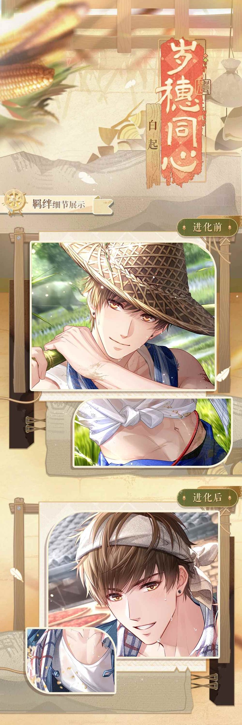 恋与制作人白起秋收之约卡面,SSR羁绊【白起·岁穗同心】上线~8月21日~9月1日,【悦丰年】七夕丰收主题活动开启。参与活动,自选获取SSR羁绊【白起·岁穗同心】、配套服装与田园背篓自选礼盒!一起来和小编看看吧~