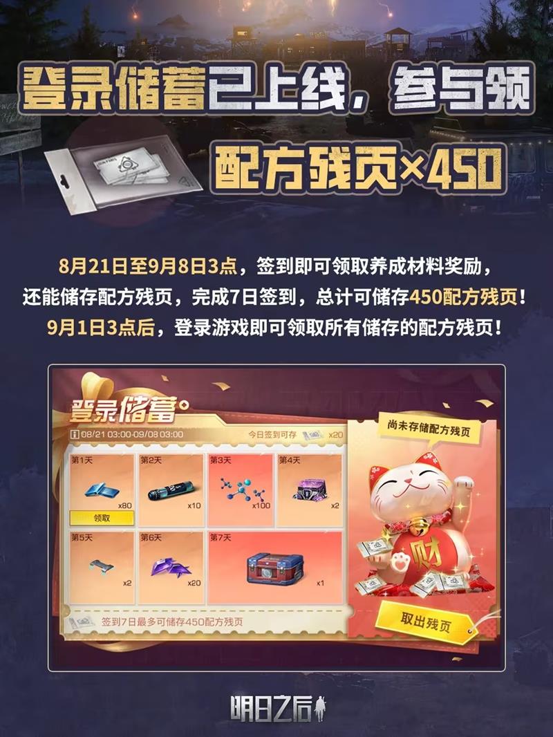 从即日起至9月8日3点,玩家们只需登录游戏,即可参与【登录储蓄】活动。在活动期间,玩家可以通过签到获得稀有微晶、潜能胶囊等多种养成材料奖励。此外,玩家还可以储存配方残页,以便在需要时统一取出。
