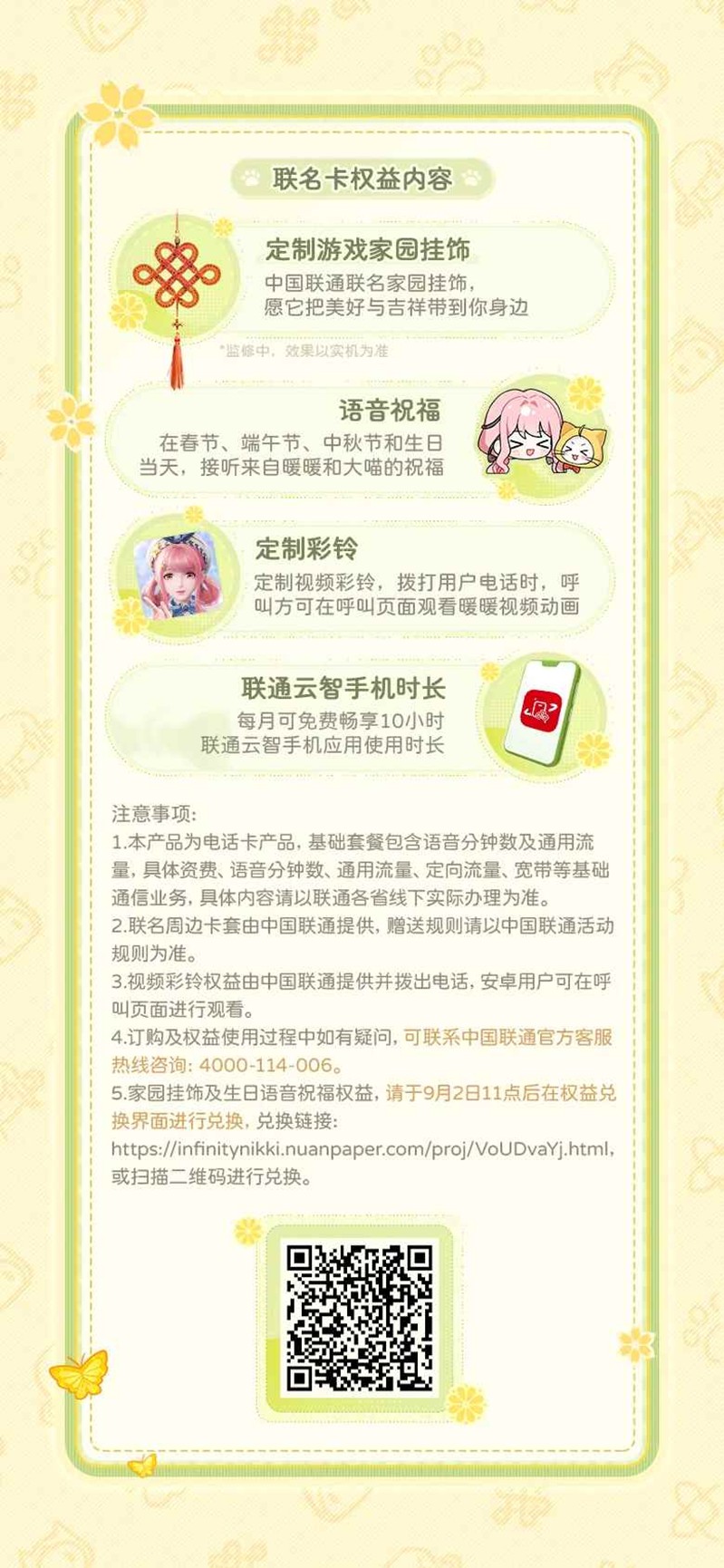 专属电话卡面、定制视频彩铃、联名家园挂饰、暖暖&大喵语音祝福......